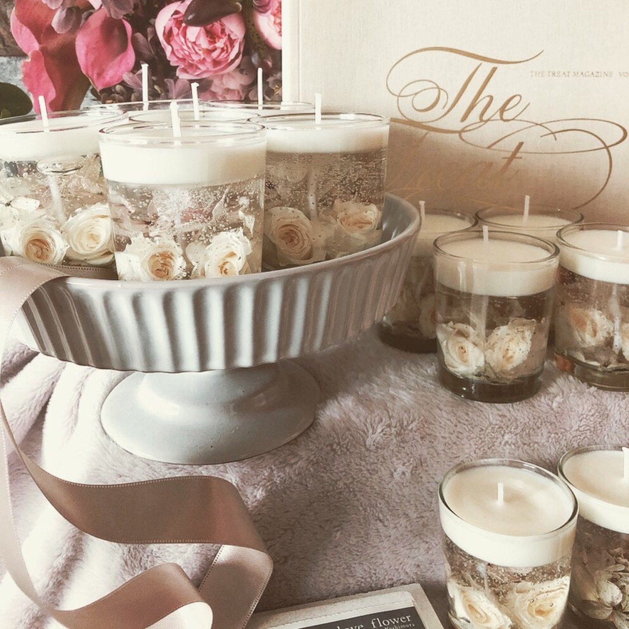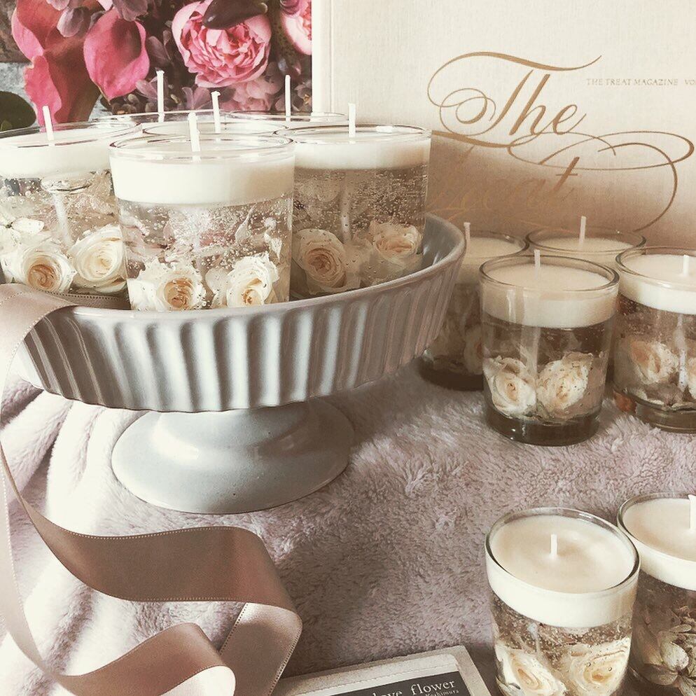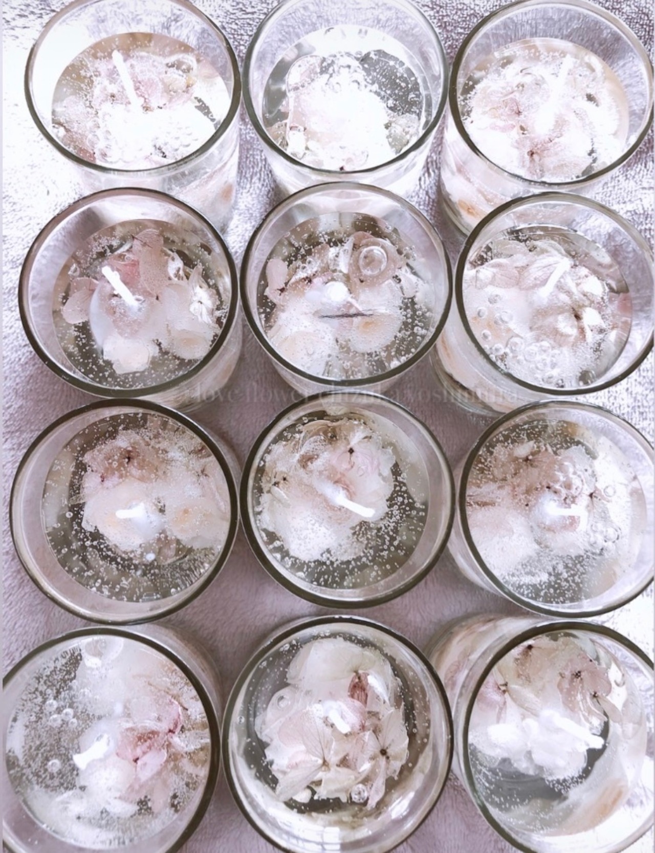 ジェルワックスとソイワックスの二層キャンドルです♡中には白いバラ、紫陽花のプリザーブドフラワーが入っています(^ ^)