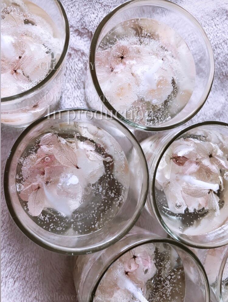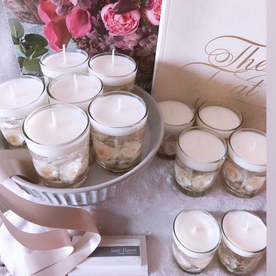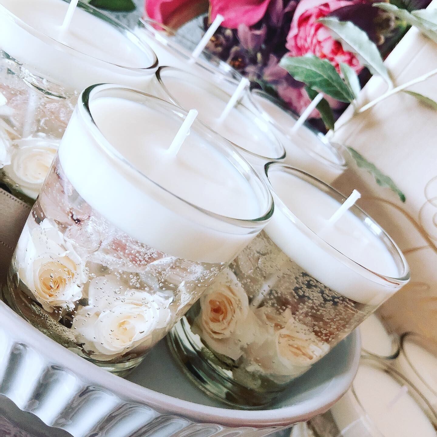 ジェルワックスとソイワックスの二層キャンドルです♡中には白いバラ、紫陽花のプリザーブドフラワーが入っています(^ ^)